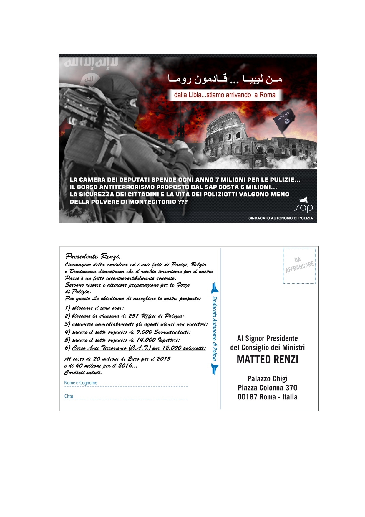 LECCE- “Il Sindacato Autonomo di Polizia a marzo 2015 ha organizzato una campagna di sensibilizzazione distribuendo ai Cittadini delle cartoline indirizzate al premier Renzi raffiguranti i terroristi dell’ Isis che bruciano il Colosseo; purtroppo siamo stati buoni Profeti“- scrivono dal sindacato leccese.