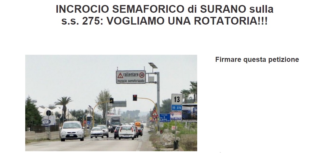 (https://www.change.org/p/anas-vogliamo-una-rotatoria-sulla-s-s-275-incrocio-semaforico-di-surano?recruiter=345820656&utm_source=share_petition&utm_medium=whatsapp) per chiedere ad Anas e al ministro delle Infrastrutture, Graziano Delrio, di risolvere la situazione. Ogni giorno lì, soprattutto in orari di punta, si formano lunghe code e la pericolosità del tratto è data soprattutto dalla presenza nei dintorni di numerosi centri commerciali.
