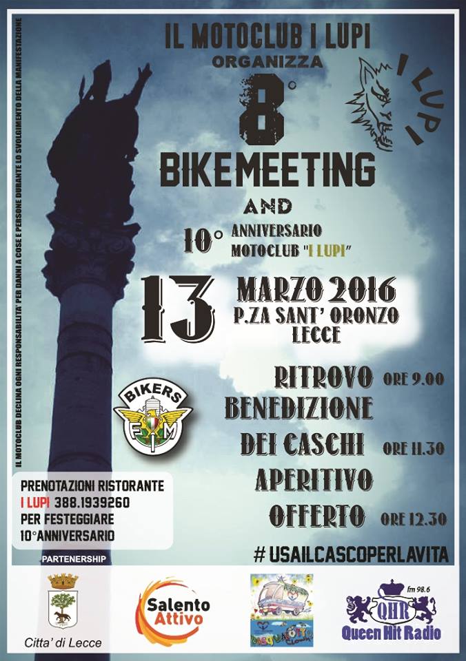 Al via dunque l’8^ Edizione del “Bike Meeting”; domenica 13 marzo alle ore 9:30 i motociclisti e gli appassionati delle due ruote si ritroveranno in Piazza Sant’Oronzo, saranno presenti i clown della Bimbulanza con le “Uova” da vendere a sostegno del proprio progetto e gli speaker di Queen Hit Radio ad allietare l’evento. Alle ore 11:00 la manifestazione entrerà nel vivo con la “benedizione dei caschi” officiata dal Priore del Convento dei Padri Passionisti di Novoli, Padre Luca Fracasso. A seguire ci sarà il ringraziamento dei gruppi intervenuti e la degustazione dell’aperitivo.