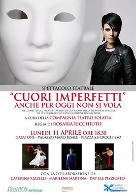 TUGLIE- Nel Teatro Comunale di Tuglie la compagnia Teatro Solatia ha portato in scena lo Spettacolo Teatrale  “CUORI IMPERFETTI Anche per oggi non si vola”,  per la  Regia di Rosaria Ricchiuto, che è anche l’attrice protagonista e che si avvale della collaborazione di Caterina Rizzelli. Marilena Martina e Daniele Pizzicato. Con ‘ Cuori imperfetti, anche per oggi non si vola’, realizzato nell’ambito del Progetto Colpi di Genio 2014 della Provincia di Lecce ,termina la seconda rassegna culturale ‘Metti una sera a Tuglie’.