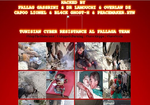 Su uno sfondo rosso: sangue, bambini morti e disperazione. Ad attaccare il sito alcuni hacker: ossia  il Fallaga team che già nel febbraio 2015 aveva colpito 20mila siti francesi.