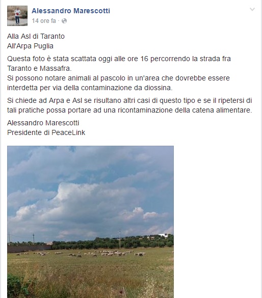 TARANTO- “Animali al pascolo in un’area che dovrebbe essere interdetta per via della contaminazione da diossina”. A lanciare l’allarme è Alessandro Marescotti di Peacelink Taranto, attraverso una foto denuncia postata sulla sua pagina Facebook.