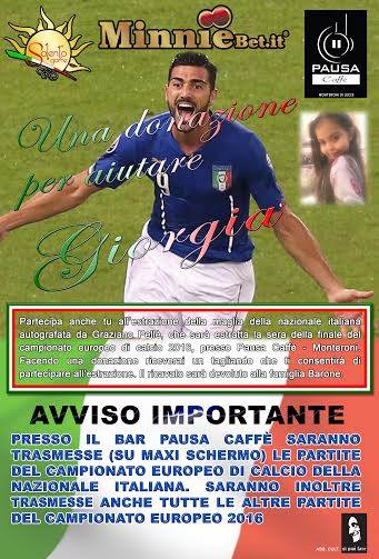 MONTERONI/LECCE- Iniziativa in favore della piccola Giorgia, affetta dalla sindrome di Berdon e che dovrà sottoporsi ad un delicatissimo trapianto multiorgano a Pittsburgh, negli Stati Uniti, dove si è trasferita da un anno con la sua mamma. A Monteroni Salento Game e Pausa Caffè hanno messo in palio la maglia autografata di Graziano Pellè indossata in occasione della recente amichevole dell’Italia contro la Finlandia: per assicurarsi la maglia dell’attaccante azzurro basta comprare un biglietto al costo di 1 euro, la cui estrazione avverrà il prossimo 10 luglio, giorno della finale dell’Europeo in corso in Francia.