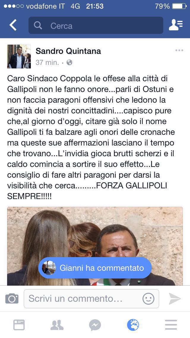 Risponde dal suo profilo Facebook Sandro Quintana: “Caro sindaco Coppola le offese alla città di Gallipoli non le fanno onore. Capisco che al giorno d’oggi, citare già solo il nome di Gallipoli faccia balzare agli onori delle cronache, ma queste affermazioni lasciano il tempo che trovano. L’invidia gioca brutti scherzi. Le consiglio di fare altri paragoni per darsi la visibilità che cerca”.