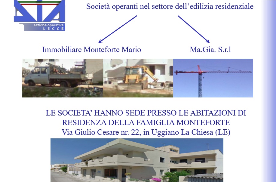 Ora la Direzione Investigativa Antimafia di Lecce sequestra beni mobili ed immobili nella disponibilità di Carmine MONTEFORTE, 55enne di Uggiano La Chiesa, per 2 milioni di Euro. Il provvedimento è stato emesso dal Tribunale di Lecce – II Sezione Penale, a seguito di proposta di misura di prevenzione patrimoniale avanzata dalla DIA dopo complesse indagini patrimoniali, delegate dalla Direzione Distrettuale Antimafia. d