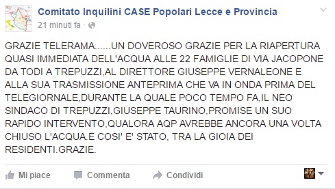 “Un doveroso grazie per la riapertura quasi immediata dell’acqua -scrivono i cittadini su Facebook- a Telerama. Ospite nell’anteprima del tg TrnewsTalk il neo sindaco di Trepuzzi, Giuseppe Taurino, promise un suo rapido intervento, qualora Aqp avrebbe ancora una volta chiuso l’acqua. E così  è stato, tra la gioia dei residenti. Grazie”.