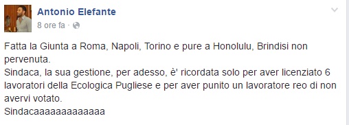 BRINDISI- “Sindaca, la sua gestione, per adesso, è ricordata solo per aver licenziato 6 lavoratori della Ecologica Pugliese e per aver punito un lavoratore reo di non avervi votato”. Questo il post pubblicato su Facebook dal Consigliere comunale brindisino Antonio Elefante con cui attacca la neo eletta Angela Carluccio che ha prontamente risposto con una denuncia-querela.