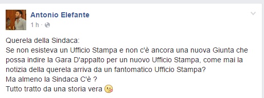 Venuto a conoscenza della querela presentata alla Digos, il consigliere Elefante replica su Fb:“Se non esisteva un Ufficio Stampa e non c’è ancora una nuova Giunta che possa indire la Gara D’appalto per un nuovo Ufficio Stampa, come mai la notizia della querela arriva da un fantomatico Ufficio Stampa?Ma almeno la Sindaca C’è ?”