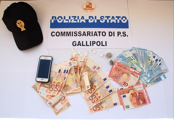GALLIPOLI- E’ stato arrestato ieri in flagranza di reato, il 19enne gallipolino Domenico Scala con in tasca quasi 2mila euro e 9 dosi di stupefacenti. Domenica sera il giovane era stato notato dai poliziotti del Commissariato di Gallipoli in una stradina parallela al lungomare jonico mentre, a bordo di un’autovettura SMART, prendeva contatti con alcuni ragazzi ai quali consegnava furtivamente “qualcosa”.