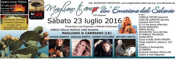 MAGLIANO-E’ pronto a partire, questa sera nella sua XII edizione, il “MAGLIANO TI AMO” Festival, nel suggestivo “Parco della Musica” di Carmiano. Una rassegna dedicata al canto e alla cultura in tutte le sue forme, nell’intento di coniugare il panorama artistico e musicale italiano alle realtà produttive del Salento.
