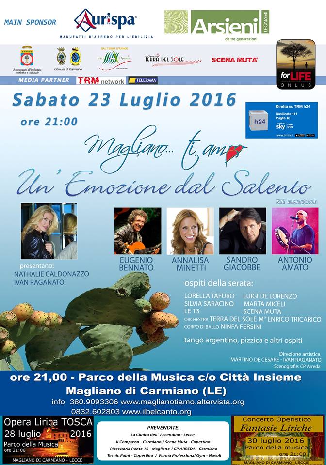 MAGLIANO- “L’emozione del Salento” si chiama Magliano Ti Amo. In scena il 23 luglio al Parco della Musica la dodicesima edizione di una delle rassegne più attese dell’estate salentina. Nata da un’idea dell’imprenditore Tonio Paladini, dal 2004 la manifestazione coniuga le risorse musicale e artistiche con la promozione economica e culturale del territorio, all’interno di un’emozionante cornice, che ogni anno si arricchisce sempre di più.