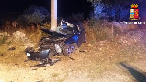 MOTTOLA-Ubriaco e sotto l’effetto della droga, perde il controllo dell’auto e si schianta contro un palo di cemento di sostegno dei cavi elettrici. Paura per un 19enne, rimasto vittima  nella notte, di un incidente stradale. E’ accaduto sulla SP 30 in località C.da San Francesco, nell’agro di Mottola, mentre il giovane rientrava a casa.