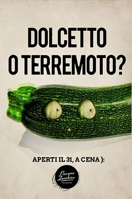 BRINDISI- “Dolcetto o terremoto?”. Proprio mentre il cuore dell’Italia ha ricominciato a tremare, seminando panico e altri crolli, su Facebook qualcuno ha postato una foto che ha generato non poche polemiche. In vista dei festeggiamenti per la notte di Halloween, sulla pagina “Piovono Zucchine”, un ristoratore brindisino ha pubblicato l’immagine di una zucchina animata con scritto “Dolcetto o terremoto?”, annunciando l’apertura del proprio locale per la cena del 31 ottobre.
