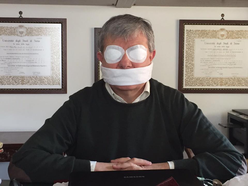 La risposta del Sindaco è giunta su Facebook con una foto in cui si fa vedere imbavagliato e bendato: “C’è chi mi vorrebbe cieco, sordo e soprattutto muto– scrive prendendosela con lo sconosciuto autore di quella intercettazione ambientale e di chi l’ha resa pubblica- Non so se sia reato o meno registrare e diffondere una conversazione privata all’insaputa di chi vi partecipa. Se è per questo non ricordo neppure dove, quando e in presenza di chi avrei accostato un consigliere comunale alla nobile gonade maschile. In ogni caso, lungi da me la volontà di rendere pubblica una qualsiasi personale opinione su chicchessia, soprattutto se espressa in una sfera privata e confidenziale….”