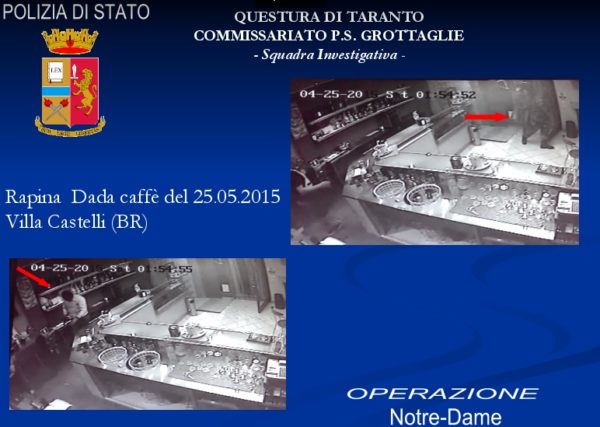Tutto ha avuto inizio il 31 agosto 2014, quando i proprietari della pizzeria Notre Dame di Grottaglie (da qui il nome dell’operazione), hanno subito una rapina a mano armata. Tre banditi armati, dopo aver puntato la pistola alla tempia di un bimbo di 8 anni, intimarono ai proprietari di consegnare l’incasso, circa 5mila euro. Poi sparirono facendo perdere le proprie tracce. Stesso modus operandi è stato riscontrato in altre rapine: il 28 settembre 2015 ai danni della titolare di un’agenzia assicurativa; il 25 maggio 2015 al Dada Caffè di Villa Castelli e pochi giorni dopo, all’Eurospin di Grottaglie. E ancora, gli indagati si sospetta che siano anche i responsabili di un furto messo a segno a giugno 2015 a Grottaglie, da “Cifarelli”, e di una spaccata al distributore PetrolMenga di Ceglie Messapica, avvenuta dieci agosto 2015.