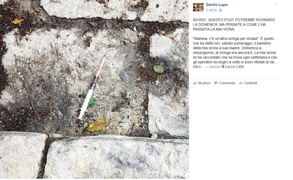 LECCE- Via Dalmazia, una traversa di via Leuca, a Lecce. L’allarme per una siringa sporca per strada, parte dal social. E’ il giornalista Danilo Lupo a riportare la denuncia di una donna, la quale racconta di trovarne ogni settimana e che gli operatori ecologici a volte si sono anche rifiutati di raccoglierle. E quindi, per paura che il figlio possa venirne a contatto, spesso è lei stessa a buttarle via. La foto suscita lo sdegno di molti cittadini. Interviene l’assessore Andrea Guido che personalmente si reca sul posto.