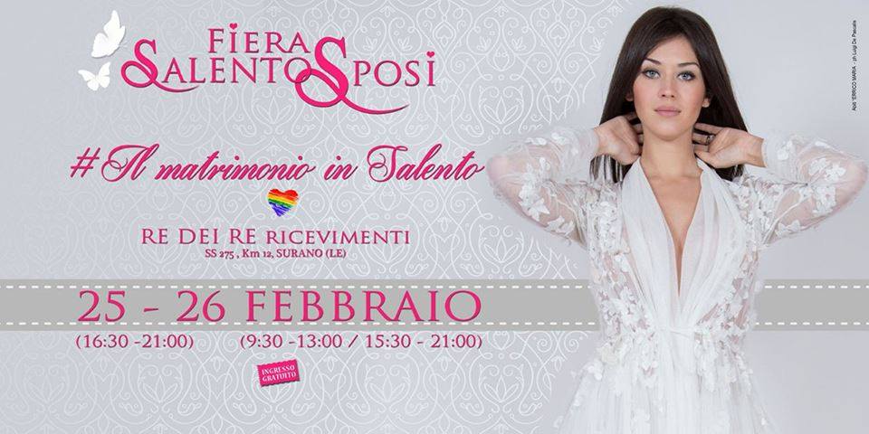 SURANO- Oltre 70 aziende leader del settore wedding illustreranno le novità 2017/2018 in fatto di matrimonio a Fiera Salento Sposi , evento dedicato ai futuri sposi e anche alle unioni civili, che sabato 25 e domenica 26 febbraio fa tappa nella Sala Ricevimenti “Re dei Re” di Surano con ingresso gratuito.