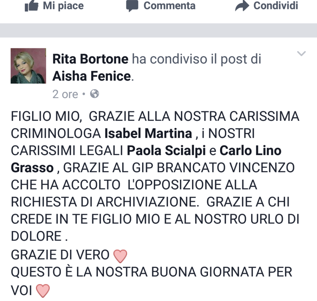 crede in te figlio mio e al nostro urlo di dolore” scrive.