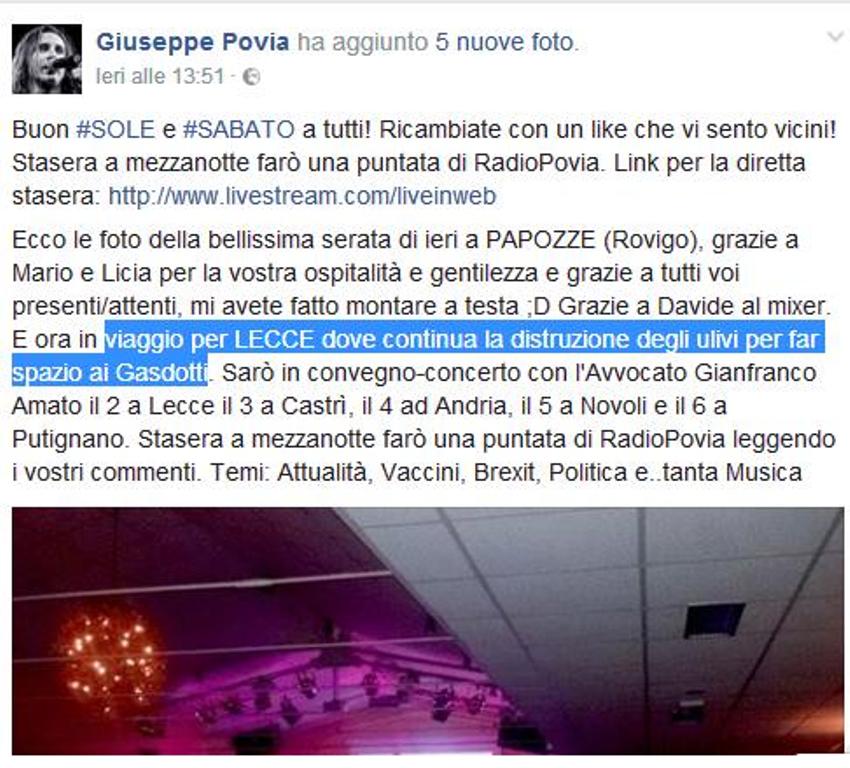 Del resto, Povia da sempre scrive e canta canzoni “sociali”, che fanno riflettere sulla realtà che ci circonda. Anzi, proprio qualche giorno fa, in vista della tappa a Lecce ha anche pubblicato un post su Fb facendo riferimento a Melendugno: “in viaggio per LECCE -si legge- dove continua la distruzione degli ulivi per far spazio ai Gasdotti”.