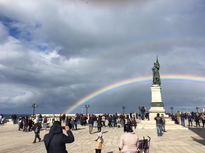 OTRANTO- Pioggia e nuvole hanno sicuramente rovinato molte scampagnate e pic-nic organizzati all’aperto ma hanno regalato anche questo spettacolo incredibile sul lungomare di Otranto. In questa foto un meraviglioso arcobaleno illumina con i suoi colori il mare otrantino e il lungomare degli Eroi, stagliandosi alle spalle del monumento che rappresenta l’allegoria della Patria. Tante le famiglie e i bambini rimasti incantanti. In tanti, con macchinette e cellulari alla mano hanno voluto immortalare il momento.