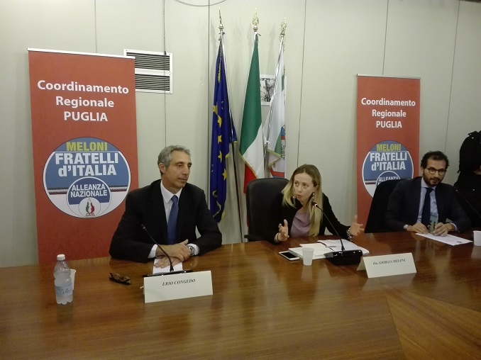 BARI – Il crisma dell’ufficialità è impartito dalla presenza della leader nazionale Giorgia Meloni. Erio Congedo, archiviato il divorzio da Raffaele Fitto, è da ora in Fratelli d’Italia. “Un ritorno a casa”, lo ha definito la Meloni, avvenuto non a caso a Lecce. “Pierpaolo Signore – ha aggiunto – sta lavorando bene, il clima è vibrante e lo si vede dalle ultime adesioni”. “La scelta di Erio e ma anche di tanti altri, uomini e donne, che si stanno avvicinando a Fratelli d’Italia – ha spiegato l’ex ministro – dimostra come in questi anni abbiamo lavorato senza poteri forti alle spalle, in rappresentanza degli italiani, per ridare una casa alla storia della destra italiana ma anche per avvicinare esperienze politiche diverse. La scorsa settimana sono entrati due consiglieri comunali, sempre di Lecce, sono molto molto fiera del lavoro che stiamo facendo”.