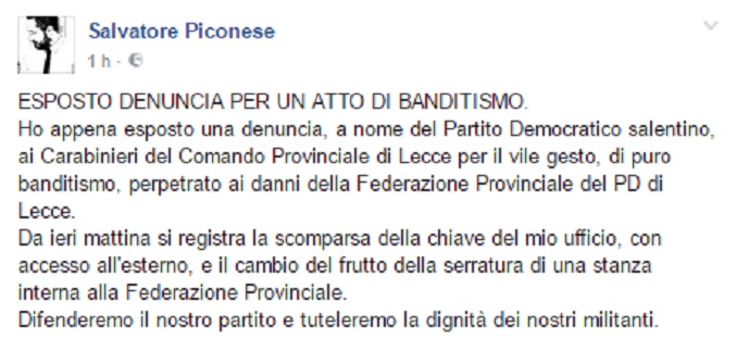 LECCE- “Ho appena esposto una denuncia, a nome del Partito Democratico salentino, ai Carabinieri del Comando Provinciale di Lecce per il vile gesto, di puro banditismo, perpetrato ai danni della Federazione Provinciale del PD di Lecce”. Così scrive su Facebook il segretario provinciale del Pd Salvatore Piconese.