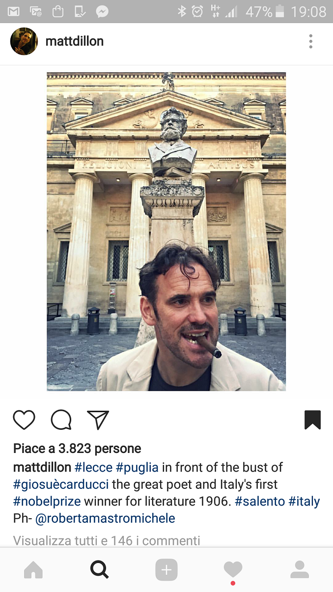 LECCE- “Di fronte al busto di Giosuè Carducci, il grande poeta e primo vincitore italiano del premio Nobel per la letteratura 1906”. E’ la didascalia alla foto scattata davanti al Convitto Palmieri di Lecce, ieri, da Matt Dillon, l’attore e regista statunitense candidato all’Oscar come migliore attore non protagonista per il film Crash- Contatto fisico.