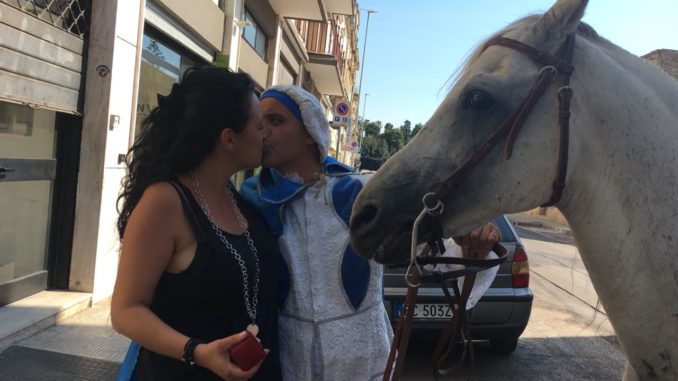 LECCE- Le favole non solo si vivono nei sogni ma anche nella realtà. Proprio come accaduto a Francesca che da un momento all’altro si è vista giungere su un cavallo bianco il suo Principe Azzurro. E’ accaduto nel pomeriggio in città: Gianluca ha cavalcato  via Costadura per giungere fino al negozio dove   la sua Principessa era alle prese con il lavoro. Invocando il suo nome, è così sceso da cavallo  e sotto gli occhi increduli e divertiti di tanti, l’ha chiesta in sposa porgendole un anello. Inutile commentare lo stupore di Francesca e il suo Sì, tra baci e abbracci. I due convivono insieme ormai da 10 anni, hanno due figli, ma nonostante questo la loro storia d’amore si accende ogni giorno come se fosse il primo. E ora, dopo questa romantica sorpresa, Gianluca promette anche un matrimonio  fiabesco: le nozze si celebreranno  a Copertino in  “Piazza del Popolo” il 24 luglio.