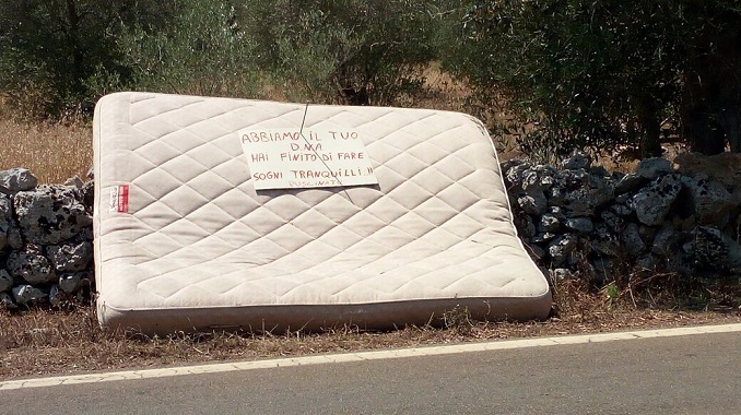 ANDRANO- Tanta ironia ma anche tanta amarezza: “Abbiamo il tuo dna, hai finito di fare sogni tranquilli!!! Ruscinato (sporco, ndr)”. E’ il sarcastico cartello apparso su un materasso abbandonato indiscriminatamente nelle scorse ore sul ciglio della strada provinciale che collega Andrano alla frazione di Castiglione d’Otranto.