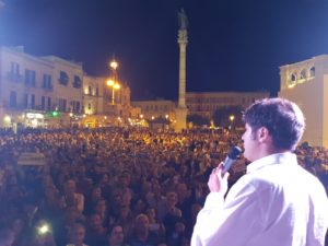 LECCE- Stesso luogo, nel cuore di Lecce. Stesso abbigliamento, una camicia bianca. Emozione e verve nella voce di entrambi: per convincere i leccesi a tornare alle urne e crociare il proprio nome, domenica, Carlo Salvemini e Mauro Giliberti hanno scelto di chiudere la loro lunga campagna elettorale in piazza Sant’Oronzo, in tutti e due i casi gremita di sostenitori.