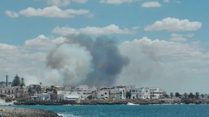 GALLIPOLI-S.MARIA AL BAGNO- Paura nel pomeriggio lungo la litoranea Gallipoli – S.Maria al Bagno dove in località Montagna Spaccata un vasto incendio ha distrutto circa 20 ettari di macchia mediterranea, raggiungendo anche un bosco. Per domare le fiamme è stato necessario anche l’intervento dei canadair che hanno operato tre lanci. La zona interna infatti, particolarmente impervia, non poteva essere raggiunta dai mezzi dei vigili del fuoco e della protezione civile che hanno comunque lavorato per diverse ore. Il forte vento di tramontana ha reso tutto più difficile. I tre focolai si sono congiunti dando vita ad un incendio e ad una nube di fumo ben visibile da tutte le zone circostanti.