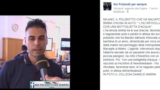 MILANO- “L’ho rifocillata con una bottiglietta d’acqua, bagnandole piedi e polsi in attesa dell’ambulanza”. Così il poliziotto Daniele Marra, originario di Alessano ma da anni in servizio a Milano, dichiara nel corso di un’intervista. E’ stato lui a prendersi cura della bimba di un anno, dimenticata per circa un’ora dalla madre nel parcheggio della metropolitana Bisceglie a Milano. A rendere nota la notizia è la pagina Facebook “Noi
