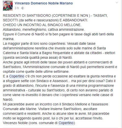 SANT’ISIDORO- Dopo il nostro servizio, interviene con un post su Facebook il consigliere comunale di Copertino Vincenzo Nobile: “Abbandono, menefreghismo, cattiva amministrazione. Eppure il Comune di Nardò si fa ben pagare le tasse dagli abiti tanti della marina. La maggior parte di loro sono copertinesi. Vessati dalle tasse dell’amministrazione neretina -si legge nel post- che investe solo sulle marine di Santa Caterina e Santa Maria a Bagno frequentate e abitate da cittadini – elettori di Nardò. Anche grazie agli introiti delle tasse dei poveri abitanti e commercianti di Sant’Isidoro, l’Amministrazione comunale di Nardò può permettersi eventi e ospitate come quelle delle ultime settimane. E a Copertino c’è chi non perde occasione ad esaltare la giunta neretina e a sfoggiare selfie con Sindaco e Assessori… ma poi per dirsi cosa? Dato il grado di abbandono, l’incuria e l’assenza di una minima programmazione amministrativa – culturale su Sant’Isidoro, di certo non avranno parlato di come viene re-investito il denaro che i copertinesi versano nelle casse di Nardò. Mi piacerebbe –conclude il consigliere– avere un incontro con il Sindaco Mellone e l’assessore Comunale alle Marine. Visitare insieme Sant’Isidoro, ascoltare commercianti e residenti”.
