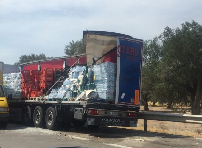 BRINDISI – Lunghe code e rallentamenti sulla  Brindisi-Lecce, a causa di un violento scontro tra due camion. L’incidente è avvenuto in mattinata nei pressi dello svincolo per Cerano.  Da una prima ricostruzione del sinistro, sembra che  uno dei tir  in fase di sorpasso abbia tranciato letteralmente la fiancata  dell’altro mezzo che trasportava  confezioni d’acqua minerale. Nello schianto, il carico si è riversato sull’asfalto.