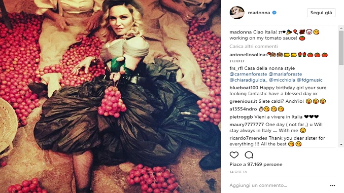SALENTO – “Ciao Italia, sto lavorando alla mia salsa di pomodoro”. Così la pop star americana Madonna si posta nuovamente su instagram, contagiata dalla “salentinità”.