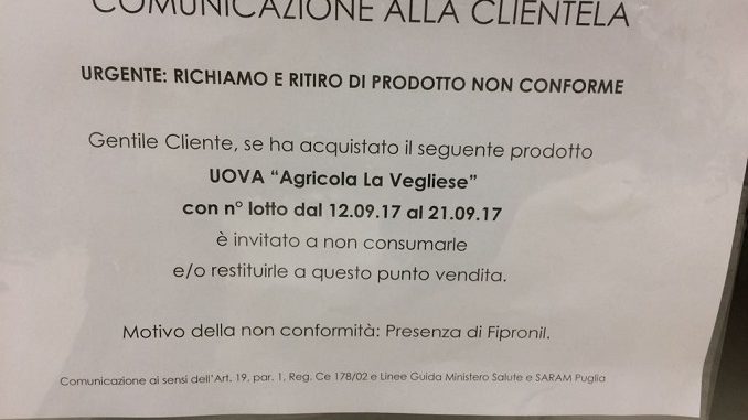 VEGLIE- Bloccato un cento di imballaggio a Veglie, dove sono state ritirate da parte dei servizi veterinari della Asl di Lecce 4mila uova contaminate dall’insetticida denominato Fipronil.