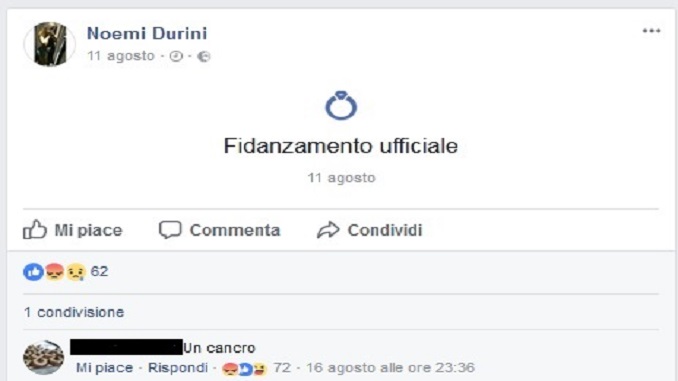 SPECCHIA – Se di amore si può parlare, quello tra Noemi Durini e Lucio di sano sembra proprio non aver avuto nulla. Un rapporto che non poteva certamente godere della benedizione della famiglia di lei, che più volte aveva visto rientrare a casa la figlia con segni di violenza sul corpo, stando alla denuncia sporta dalla madre. Ma i retroscena viaggiano in rete, e riguardano anche il padre di lui: lo scorso 11 agosto Noemi aggiorna lo stato sentimentale sul suo probilo fb da “single” in “fidanzata ufficialmente”. Il padre di Lucio è il primo a commentare: “un cancro” scrive.