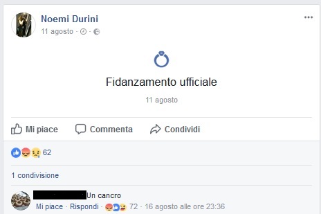 I due profili, poco dopo la confessione e il ritrovamento del cadavere di Noemi, si trasformano nuovamente: il sole e la luna. Sulla bacheca fb di lei tantissime le immagini e le dediche. Amici, compaesani, compagni di scuola: “ti ricoderemo così: felice spensierata -scrivono- un angelo strappato via troppo presto dalla violenza, rifugio degli incapaci“. Sulla bacheca di lui, invece, va in scena il linciaggio di chi ancora non si spiega come abbia potuto un 17enne uccidere e tacere tanto a lungo proprio lei, Noemi, che per lui la vita l’avrebbe data, ma certamente non così.