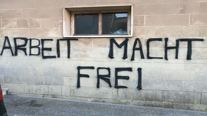 Vernice nera spray e un chiaro richiamo alla deportazione:  si tratta infattidel motto posto all’ingresso di numerosi campi di concentramento nazisti durante la seconda guerra mondiale come quello di Auschwitz.