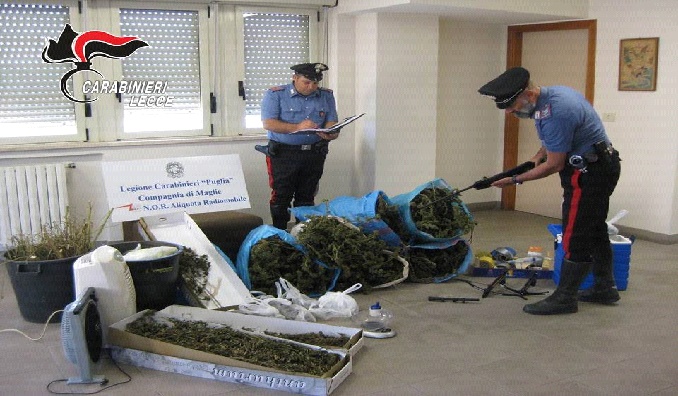 CURSI- Shop della droga in casa. A finire nei guai Donato Chilla, un contadino 53enne di Cursi. A seguito di una perquisizione domiciliare è stato trovato in possesso di oltre 15 chili di marijuana. In particolare, durante il blitz, sono stati trovati 45 grammi di droga già essiccata all’interno della cucina, oltre 1 chilo ne è stata rinvenuta in un frigo portatile, mentre in tre scatole sono stati trovati: 986 grammi di “maria”, un involucro con 177 grammi di “erba”, sempre essiccata e infiorescenze di marijuana per altri 12 chilogrammi. E ancora, i militari hanno sequestrato una carabina ad aria compressa, due balestre, vario materiale per la coltivazione delle piante e un furgone usato per occultare lo stupefacente.