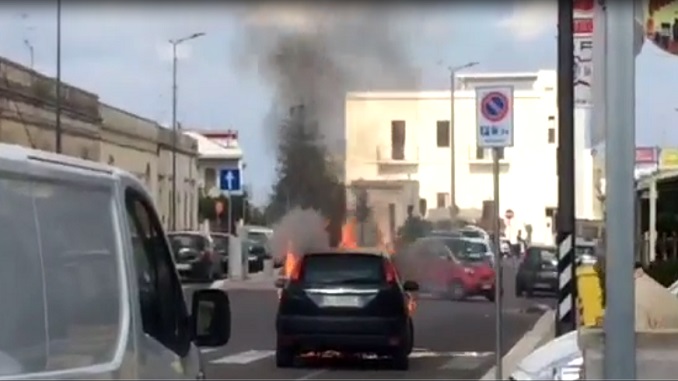 Paura in Via Adriatica, auto in fiamme sulla strada. Il video