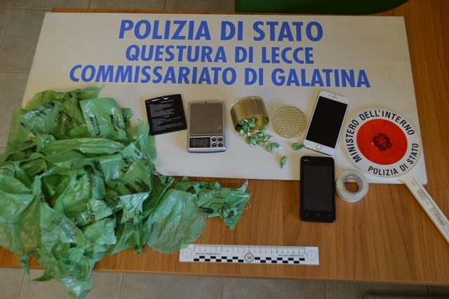 GALATINA – I poliziotti del Commissariato di Galatina hanno tratto in arresto un 31enne del posto perchè responsabile del reato di detenzione ai fini di spaccio di sostanze stupefacenti. L’uomo, già noto alle forze di polizia ed attualmente sottoposto al regime degli arresti domiciliari per reati dello stesso tipo, durante il controllo degli operatori della Volante presso l’abitazione, per accertarne la presenza dello stesso, ha destato sospetto agli agenti che potesse detenere droga. I poliziotti, infatti, hanno notato su un tavolo residui di cellophane che potevano essere stati utilizzati per confezionare dosi di sostanze stupefacenti. La successiva perquisizione domiciliare ha confermato il sospetto. Sono stati rinvenuti: un barattolo all’interno del quale c’erano 17 confezioni in cellophane di colore verde, cellophane identico ai ritagli notati e rinvenuti sul tavolo dagli operatori della Volante, del peso complessivo di circa 9 grammi di cocaina; un bilancino elettronico di precisione; un rotolo di nastro isolante di colore bianco uguale a quello utilizzato per chiudere le confezioni. Il tutto è stato sequestrato e l’uomo ristretto presso la casa circondariale di Lecce.