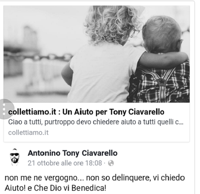 faremo beneficenza per altri bisognosi, sono in una condizione disastrosa, mi hanno sequestrato tutto e non ho più neanche un lavoro visto che si son presi la mia ditta, chi può mi aiuti, ho tre bambini, cerco lavoro ma nessuno me ne da, per favore datemi una mano Grazie e che Dio vi Benedica!”. A scrivere è Tony Ciavarello, genero del boss Totò Riina, marito della figlia Maria Concetta, la più grande, da anni residenti a San Pancrazio Salentino.