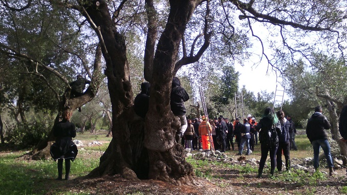 MELENDUGNO – Torna la tensione lungo il tracciato del gasdotto Tap. In mattinata i mezzi della ditta Mello (per conto della multinazionale) sono tornati all’opera per continuare le operazioni di “potatura” degli ulivi. Sul posto anche gli attivisti del comitato No Tap che, insieme ad altri altri liberi cittadini (donne, anziani e bambini), hanno manifestato pacificamente il proprio dissenso. Nervi tesi quando ad essere tagliati sono stati i rami degli ulivi secolari.