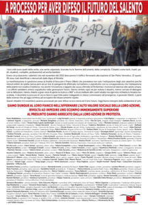 Gli imputati non saranno soli: 6mila cittadini hanno sottoscritto una petizione promossa dall’associazione bolognese Bianca Guidetti Serra, in collaborazione con il docente di diritto Costituzionale all’Università del Salento, Nicola Grasso, e Spazi Popolari. Tra i firmatari ci sono nomi di peso: in primis, il presidente emerito della Corte Costituzionale Paolo Maddalena, che tra l’altro proprio il 6 novembre, in concomitanza con l’apertura del processo davanti al Tribunale di Brindisi, sarà a Lecce, per una giornata giornata di riflessione in Ateneo su “La difesa di madre terra- processi di trasformazione capitalistica delle campagne e diritti costituzionali”.