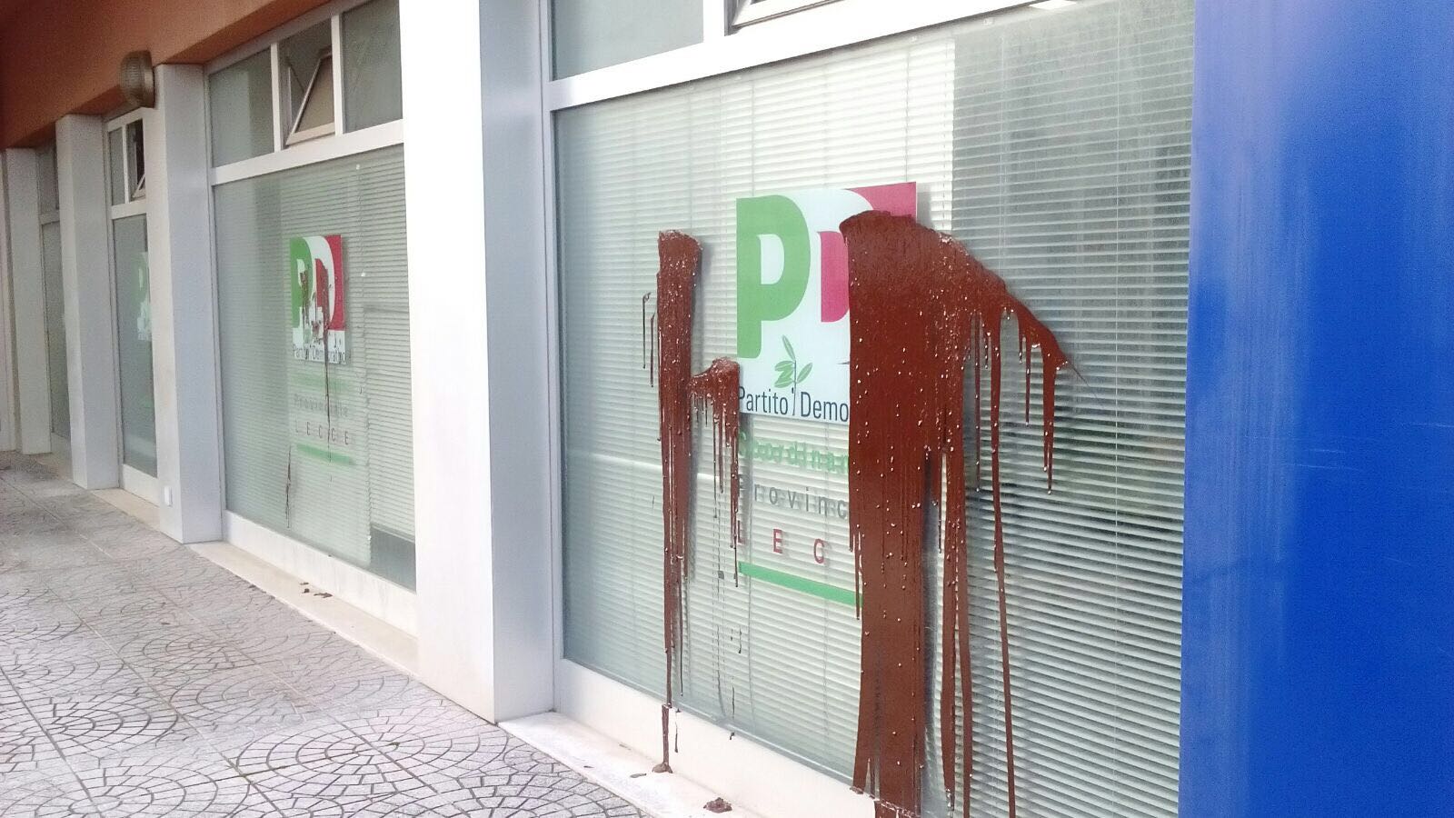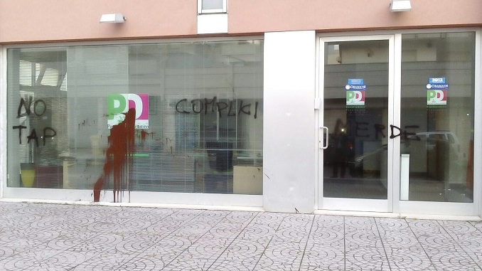 LECCE – Un assalto spray nella notte, lontano da occhi indiscreti, un messagio chiaro: la federazione provinciale di Lecce del Partito Democratico in via Tasso accusata di essere il “covo dei complici di Tap”. Una colata di vernice rossa al centro della vetrata e poi insulti, questa volta con vernice nera, con un chiaro riferimento alla posizione del partito sulla realizzazione del gasdotto a Melendugno.