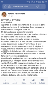 In tarda serata, Adriana Poli Bortone ha scritto una breve “lettera ai cittadini”, pubblicata sul suo profilo Fb. Come si legge, ha ribadito di essere in pace con la sua coscienza e di non aver arricchito nessun altro durante i suoi nove anni di amministrazione se non la sua città.