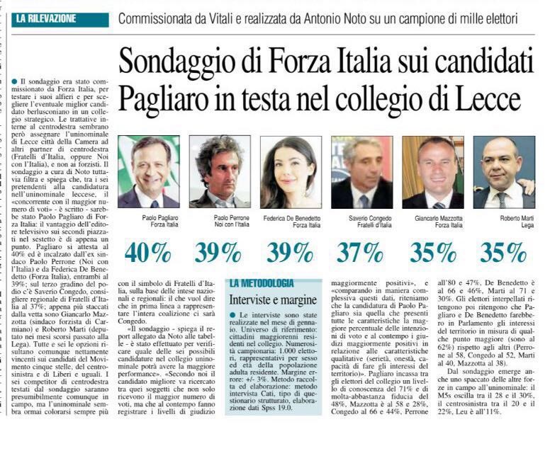 Le scriviamo per testimoniarle il nostro disappunto e la nostra delusione in merito alle notizie sulla compilazione del listino proporzionale di Lecce. Fino a sabato mattina il dott. Paolo Pagliaro, primo anche nel sondaggio, era il capolista e questo ci rendeva orgogliosi e motivati ad intraprendere una campagna elettorale per vincere ed avere finalmente, nel Salento, una persona che ha sempre lottato per la sua terra e ha ridato insieme al coordinatore on. Vitali linfa vitale al nostra Partito. Poi abbiamo saputo che tutto è cambiato e ci ritroviamo con delle persone che non rappresentano il territorio e che non possono rappresentarci, disattendendo così le volontà che lei aveva sempre espresso e cioè che i candidati fossero espressione dei territori e della società civile e imprenditoriale. Avevamo già mal sopportato le dinamiche che hanno dato vita agli uninominali ma, coscienti degli equilibri che bisogna mantenere con gli alleati, eravamo felici di essere rappresentati dal dott. Pagliaro nel listino proporzionale.Il dott. Pagliaro è la persona che ci ha ridato la speranza di una nuova politica. Crediamo in lei per non vedere vanificato l’impegno di tutti noi e speriamo che ci sia ancora il tempo per cambiare l’ordine delle cose e per ridare a Pagliaro ciò che merita, e cioè la prima posizione, se così non fosse rimarremo delusi e ci sarebbe il rischio reale di un totale disimpegno di tutti i nostri elettori….No, non va bene. No, non va bene.