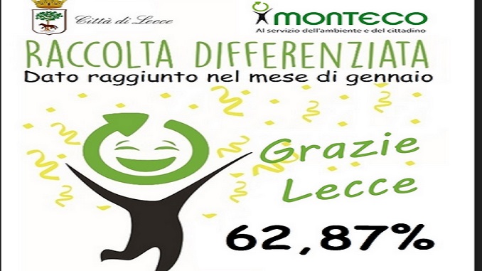 Il 2018 a Lecce in termini di raccolta differenziata inizia con il miglior risultato dall’avvio del servizio da parte di Monteco. Nel mese di gennaio si registra una percentuale del 62,87% che conferma il trend positivo superiore al 60% avviato nell’ultimo trimestre e che lascia ben sperare per il futuro.