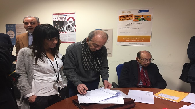 La famiglia, rappresentata dal nipote Fabio, del compianto salentino Giuseppe Grassi – Guardasigilli del quarto governo De Gasperi, fondatore della Banca del Salento e uno dei quattro statisti, insieme allo stesso Alcide De Gasperi, ad Umberto Terracini ed Enrico De Nicola ad aver firmato la nostra Carta Costituente – ha infatti giovedi, con atto notarile, donato al Dipartimento l’intero patrimonio librario della biblioteca privata del Ministro della Giustizia. Settimilacinquecentocinquantasei volumi, tra testi antichi di natura letteraria, scientifica, medica, storico-geografica e giuridica del valore economico di circa settantamila euro. Tra essi – dalla quotazione indubbiamente, quest’ultima, inestimabile – uno dei quattro esemplari originali della Costituzione italiana. Nelle prossime settimane ci sarà da affrontare il delicato contesto del trasporto e della consegna materiale dell’intero preziosissimo archivio che sarà esposto e visibile agli studenti e alla comunità salentina, pur custodito in teche che ne preservino l’integrità. Al momento della firma erano presenti le anime dell’iniziativa: l’avvocato Pasquale Corleto, presidente del centro studi “Michele De Pietro”, e i docenti universitari Francesca Manolita, Giancarlo Vallone, Francesca Lamberti e Pier Luigi Portaluri. Dal Dipartimento l’impegno a rendere tutti i testi, quanto prima, visualizzabili anche on line.